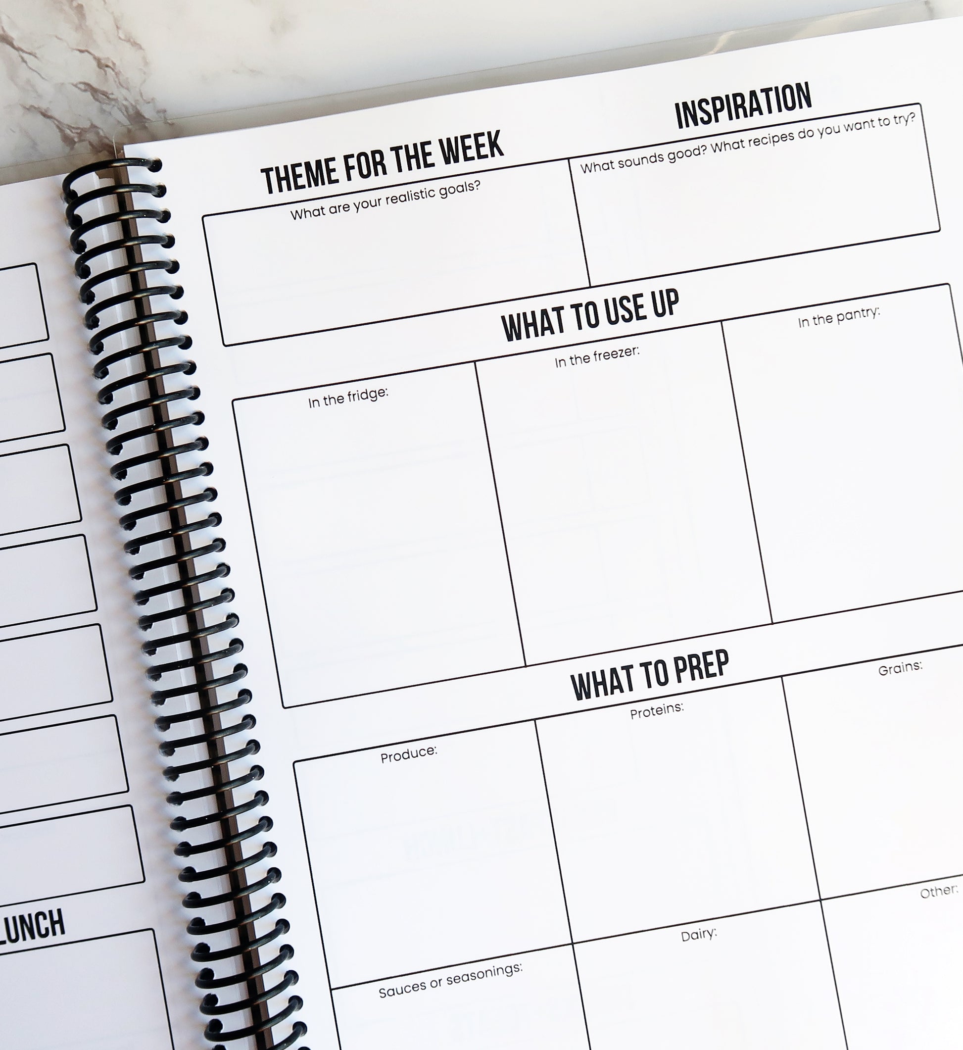 - Weekly Meal Planning: Year-long weekly spread with a grocery list, meal plan, theme + inspiration for the week, and what to use + what to prep to easily guide you through the meal planning process.